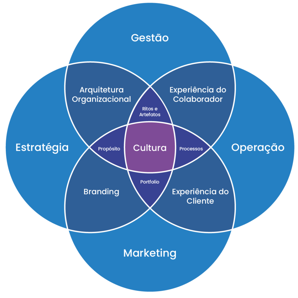 No centro do nosso framework, permeando todas as interseções entre estes eixos, está a cultura. Não a tratamos como frases bonitas espalhadas pelas paredes do escritório, nem como um quadro de valores pendurado na entrada, mas assumimos a premissa de que a cultura é o que conecta aquilo que a organização diz ao que ela, de fato, executa.